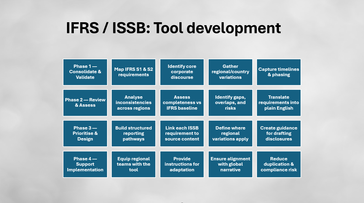 Phase 3: Prioritise and design practical solutions: We built a structured tool that linked each ISSB requirement to its source content, highlighted regional variations, and provided plain‑English guidance on how to draft compliant disclosures.